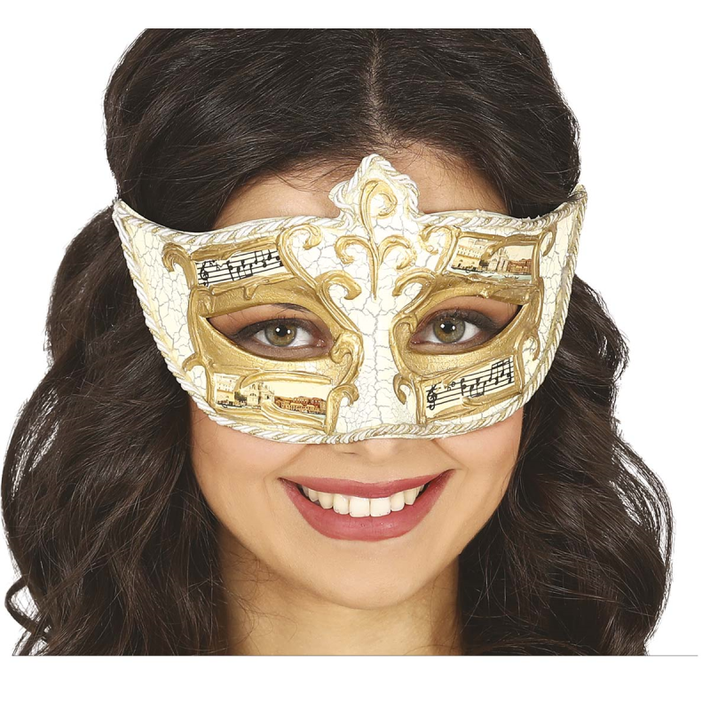 Éste Antifaz Partitura es de base en color marfil con unos detalles tanto de partitura como de Venecia. El material es rígido y se ata para adaptarla a tu tamaño