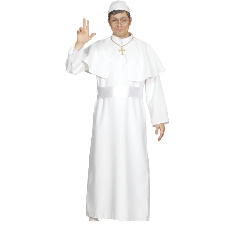 Éste disfraz de Santo Padre se compone de una Túnica de color blanco de manga larga y una cruz de tela imitando a un crucifijo. La Capelina que le sale de los hombros también es blanca.  Como complemento final de éste disfraz no te puede faltar el Casquete para la cabeza también en blanco.