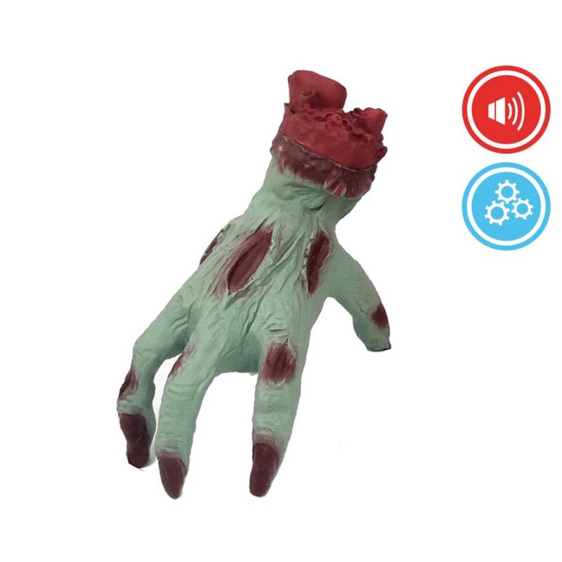 Mano animatrónica con efectos de sonido espeluznantes y movimiento automático. Tiene un tamaño de 19cm de alto por 25 cm. de largo. Pilas no incluidas.