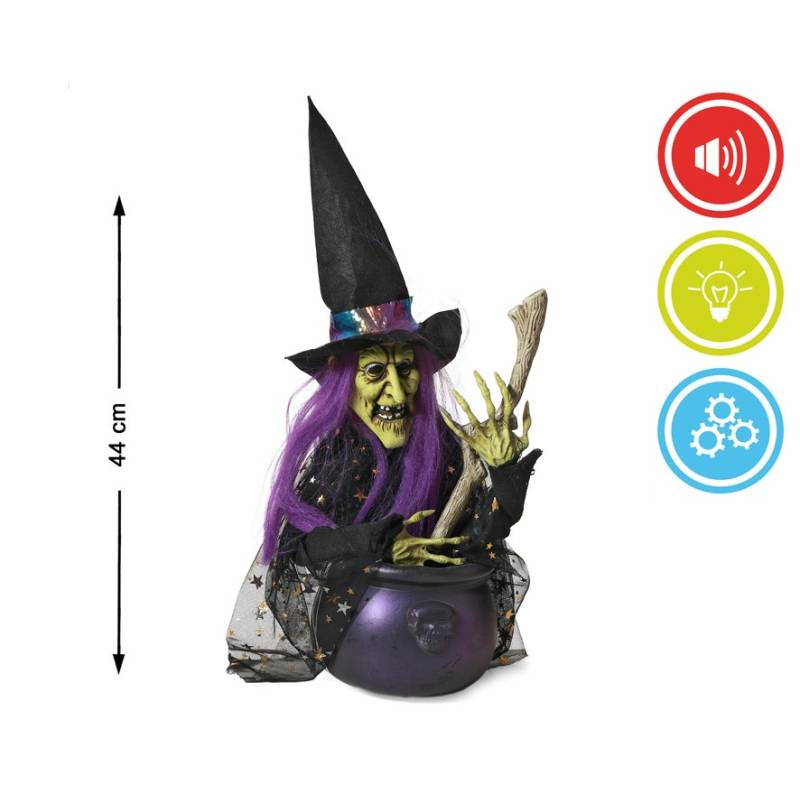 Muñeco de Bruja con Caldero, lleva luz, sonido y movimiento. Es una adorno extremecedor, muy apropiado para tu decoración de Halloween.