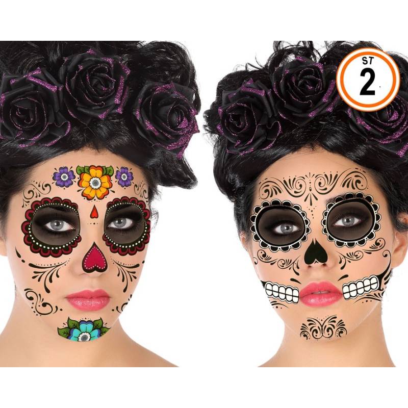 Éstos Tatuajes de Catrina es un complemento al maquillaje para tu personaje. Se trata de calcamonía. Te pones estos tatuajes en las zonas señaladas y así tienes una cara totalmente decorada en poco tiempo. Disponible en dos colores