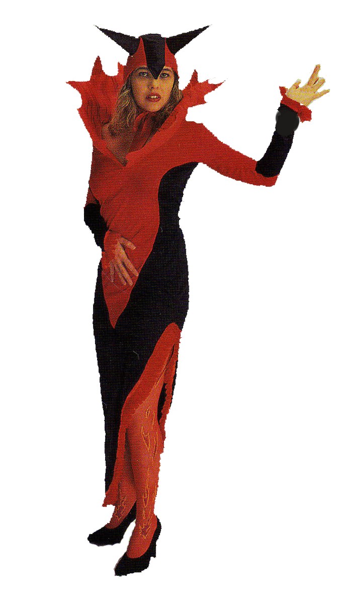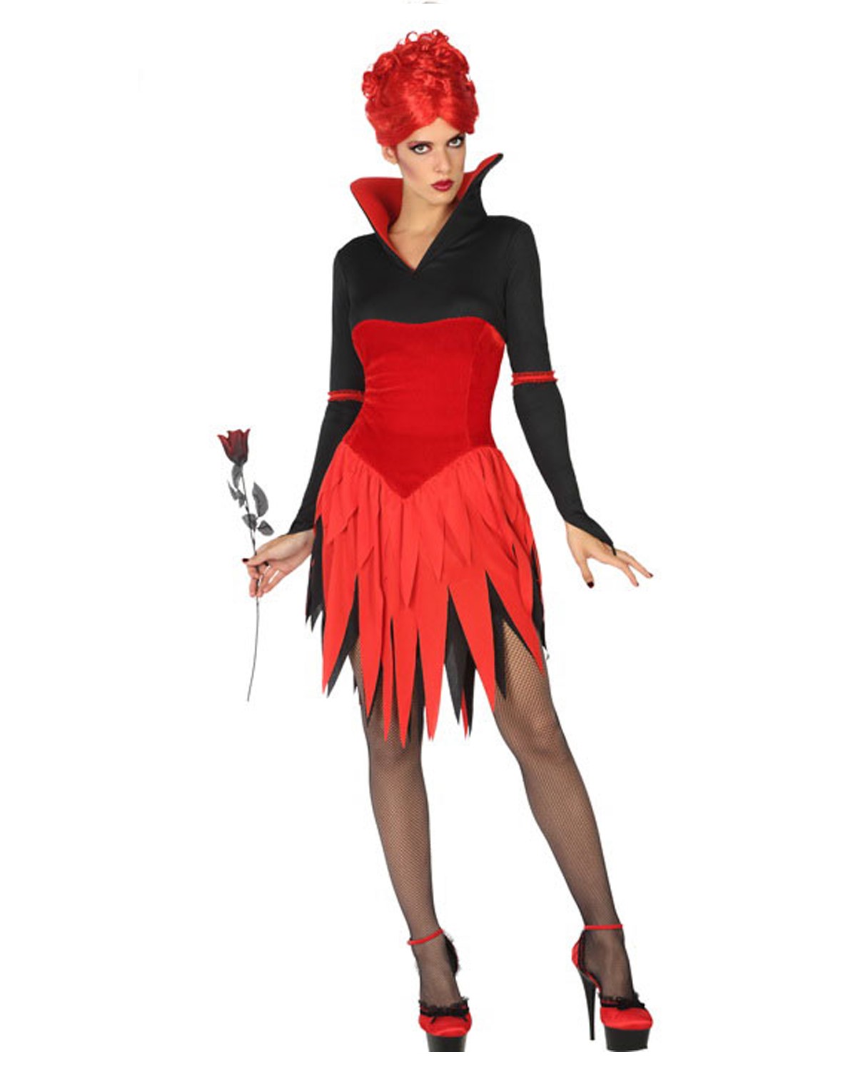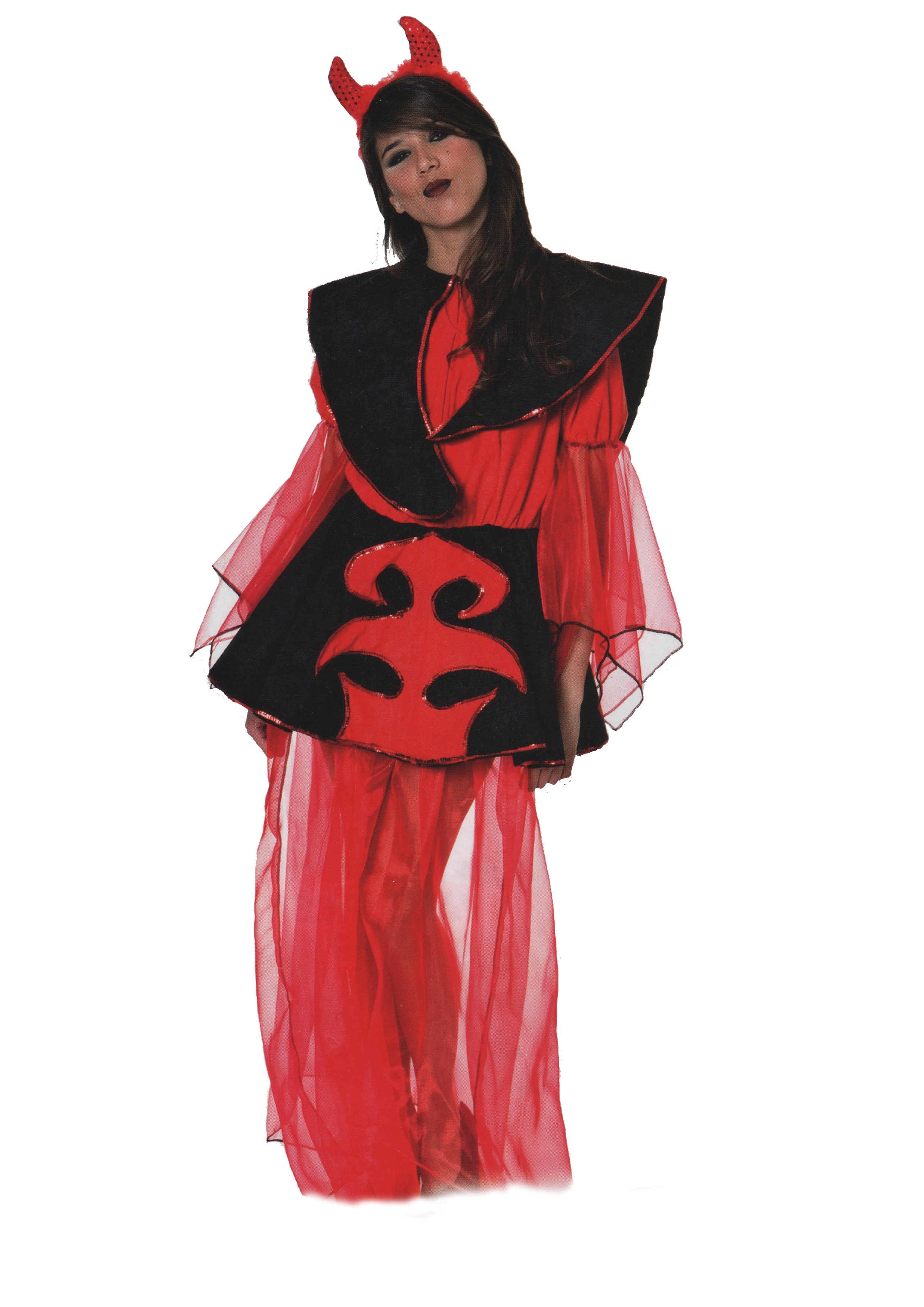 Éste disfraz de Demonia se compone de Vestido corto de color rojo con mangas largas en tul con ribetes en negro. La Faldacorta lleva can can negro y de la parte trasera sale el rabito. En el cuello atada una Sobre Capa corta en color rojo y cortada a picos. Los Cuernos rojos son de tela a juego con el disfraz.
