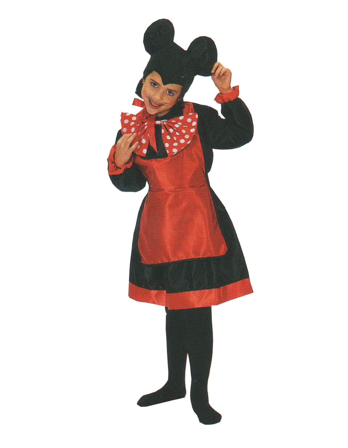 Éste Disfraz de Ratoncita se compone de un vestido negro de manga larga y falda por debajo de las rodillas.  Un delantal rojo ciñe el disfraz.  Los puños y el final de la falda llevan un ribete rojo.